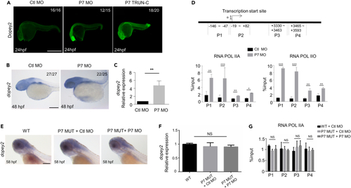 Pcdh7b regulates the transcription of dopey2 in zebrafish embryos (A) Whole-mount immunofluorescence staining detected Dopey2 protein in Ctl MO, P7 MO and P7 TRUN injected embryos at 24 hpf. Scale bar = 500 μm. (B) In situ hybridization analysis detected the expression of dopey2 in 48 hpf embryos pre-inject Ctl MO or P7 MO. Scale bar = 200 μm. (C) Real-time fluorescence quantitative PCR analysis detected the relative expression level of dopey2 gene in 48 hpf embryos pre-injected with Ctl MO or P7 MO (mean ± s.e.m, n = 3, Student’s t test: ∗∗p < 0.01). (D) The top panel represents schematic diagram of dopey2 gene primers for ChIP analysis. The bottom panel showed ChIP analysis results of 48 hpf embryos pre-inject with Ctl MO or P7 MO (mean ± s.e.m, n = 3, Student’s t test: ∗∗∗p < 0.001, ∗∗p < 0.01, ∗p < 0.05). (E) In situ hybridization analysis detected the expression of dopey2 in 58 hpf WT embryos or P7 MUT embryos pre-injected with Ctl MO or P7 MO. Scale bar = 200 μm. (F) Real-time fluorescence quantitative PCR analysis detected the relative expression level of dopey2 gene in 48 hpf WT embryos or P7 MUT embryos pre-injected with P7 MO (mean ± s.e.m, n = 3, Student’s t test: NS = not significant). (G) ChIP analysis results of 48 hpf WT embryos or P7 MUT embryos pre-injected with Ctl MO or P7 MO (mean ± s.e.m, n = 3, Student’s t test: NS = not significant). Ctl MO: control MO, P7 MO: pcdh7b MO, RNA POL IIA: RNA polymerase II with an unphosphorylated CTD, RNA POL IIO: RNA polymerase II with a phosphorylated CTD, WT: wild type, P7 MUT: pcdh7bmutant. |
