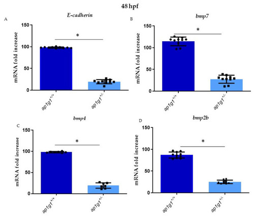 (A–D) Alterations of E-cadherin expression and different BMP factors in heterozygous and wild-type embryos, respectively: E-cadherin, bmp7, bmp4 and bmp2b. qPCR experiments were performed at 48 hpf in triplicate on cDNA samples derived from n = 30 whole embryos per condition to measure the mRNA level of E-cadherin and BMPs factor in ap1g1+/+ and ap1g1+/−. Gene expression was normalized using rpl13a as a reference gene and expressed as the mRNA fold increased. Data are representative of three replicates and are shown as the mean ± standard deviation; * p < 0.01 Student’s t-test, Statistical analysis was performed with GraphPad Version 8.3.3 GraphPad Software, Inc., Version La Jolla, CA, USA. |