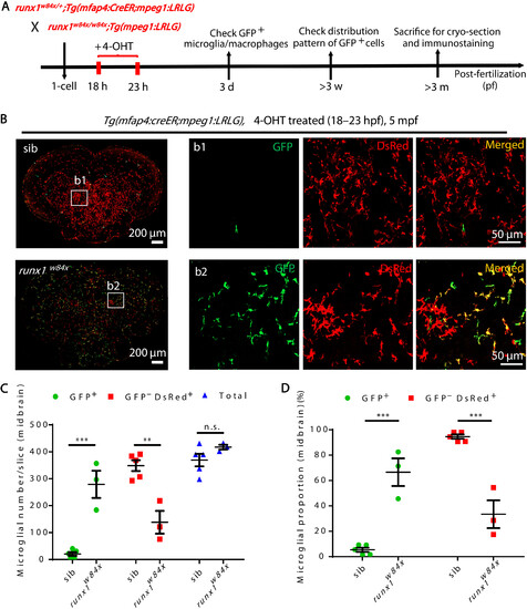 Expansion and prolonged lifespan of RBI microglia in AGM microglia-deficient runx1w84x mutants. (A) Schematic diagram shows the experimental setup for the tracing of RBI microglia in siblings and runx1w84x mutants. (B) Representative images of the midbrain cross section of 4-OHT–treated Tg(mfap4:CreER;mpeg1:LRLG) siblings and runx1w84x;Tg(mfap4:CreER;mpeg1:LRLG) mutant fish at 5 mpf. GFP+ and GFP−DsRed+ cells represent RBI and AGM microglia, respectively. (C and D) Quantification of the number (C) and proportion (D) of RBI (GFP+) and AGM (GFP−DsRed+) microglia in (B). n.s., P > 0.05; **P < 0.01; ***P < 0.001 (Student’s t test). Data were presented as mean ± SEM (sibling n = 5, runx1w84x n = 3). |