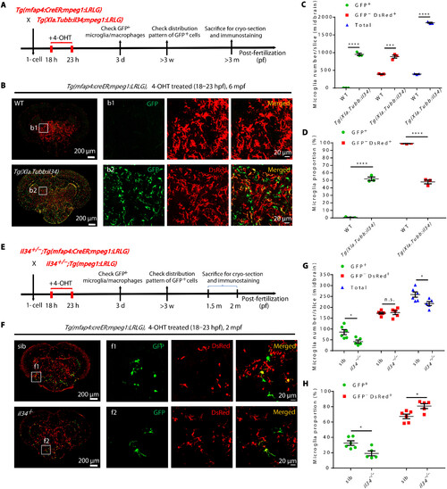 Alteration of neuron-derived Il34 level changes the proportion and lifespan of RBI microglia. (A) Schematic diagram shows the experimental setup for RBI microglia tracing in WT and Tg(Xla.Tubb:il34) fish. (B) Representative images of the midbrain cross section of 4-OHT–treated Tg(mfap4:creER;mpeg1:LRLG) and Tg(Xla.Tubb:il34;mfap4:creER;mpeg1:LRLG) fish at 6 mpf. GFP+ and GFP−DsRed+ cells represent RBI and AGM microglia, respectively. (C and D) Quantification of the number (C) and proportion (D) of RBI (GFP+) and AGM (GFP−DsRed+) microglia in (B) (n = 3 for each genotype). (E) Schematic diagram shows the experimental setup for RBI microglia tracing in siblings and il34−/− mutants. (F) Representative images of the midbrain cross section of 4-OHT–treated Tg(mfap4:CreER;mpeg1:LRLG) siblings and il34−/−;Tg(mfap4:CreER;mpeg1:LRLG) mutant fish at 2 mpf. GFP+ and GFP−DsRed+ cells represent RBI and AGM microglia, respectively. (G and H) Quantification of the number (G) and proportion (H) of RBI (GFP+) and AGM (GFP−DsRed+) microglia in (F) (sibling n = 6, il34−/− n = 5). n.s., P > 0.05; *P < 0.05; ***P < 0.001; ****P < 0.0001 (Student’s t test). Data were presented as mean ± SEM. |