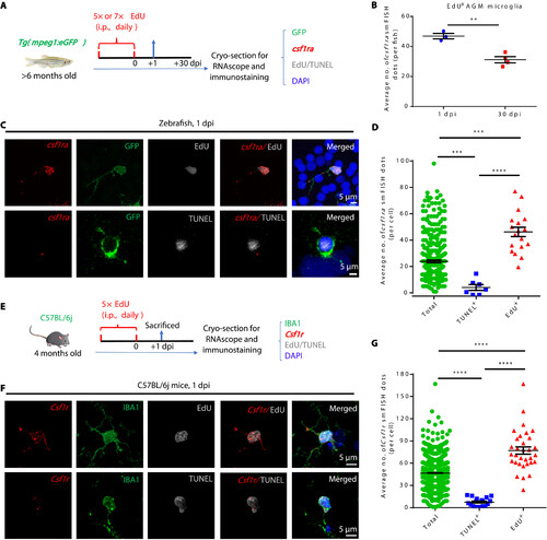 Csf1ra/CSF1R level determines the fitness of adult microglia in zebrafish and mice. (A) Schematic diagram shows the experimental setup for RNAscope smFISH (red), anti-GFP/Lcp1 (green), EdU or TUNEL (white), and DAPI (blue) multicolor staining in adult zebrafish. (B) Quantification of csf1ra smFISH dots in EdU+GFP+ at 1 dpi and 30 dpi (1 dpi n = 3, 30 dpi n = 4). (C) Representative images show the expression of csf1ra in EdU+GFP+ and TUNEL+GFP+ microglia in adult zebrafish. (D) Quantification of csf1ra smFISH dots in EdU+GFP+, TUNEL+GFP+, and GFP+ (total) microglia at 1 dpi (total n = 312, TUNEL+ n = 7, EdU+ n = 18). (E) Schematic diagram shows the experimental setup for RNAscope smFISH (red), anti-IBA1 (green), EdU or TUNEL (white), and DAPI (blue) multicolor staining in adult mice. (F) Representative images show the expression of Csf1r in EdU+IBA1+ and TUNEL+IBA1+ microglia in 4-month-old C57BL/6j mice. (G) Quantification of csf1r smFISH dots in EdU+IBA1+, TUNEL+IBA1+, and IBA1+ (total) microglia shown in (F) (total n = 1348, TUNEL+ n = 18, EdU+ n = 32). **P < 0.01; ***P < 0.001; ****P < 0.0001 (Student’s t test). Data were presented as mean ± SEM. |