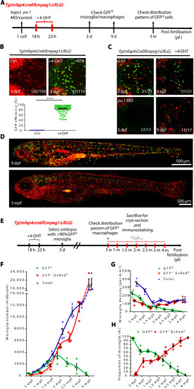 The developmental dynamics of RBI and AGM microglia. (A) A timeline indicates 4-OHT treatment and fluorescent imaging of Tg(mfap4:CreER;mpeg1:LRLG) embryos. (B) Fluorescence imaging of microglia in the brain of 3 dpf Tg(mfap4:CreER;mpeg1:LRLG) embryos treated with 4-OHT from 18 to 23 hpf (top) and quantification of the label efficiency by percentage (GFP+ cells in total microglia in 3-dpf brain) (bottom) (Ctrl n = 105, +4-OHT n = 119). (C) Fluorescence imaging of microglia in the brain of 3 and 9 dpf control or pu.1 MO injected Tg(mfap4:CreER;mpeg1:LRLG) embryos treated with 4-OHT from 18 to 23 hpf. (D) Fluorescence imaging of 4-OHT–treated Tg(mfap4:CreER;mpeg1:LRLG) larva at 9 dpf and 3 wpf. Zebrafish larvae were in lateral view with anterior to the left to visualize the distribution of GFP+ cells throughout the body. (E) Schematic diagram shows the experimental setup for the treatment of embryos with 4-OHT and collection of samples for cryo-section. (F) Quantification of the absolute number of RBI and AGM microglia in the developing and adult midbrain. (G) Quantification of the density of RBI and AGM microglia in the developing and adult midbrain. (H) Quantification of the proportion of RBI and AGM microglia in the developing and adult midbrain. (F) to (H) Data were presented as mean ± SEM (3 dpf n = 12, 3 wpf n = 5, 1 mpf n = 5, 1.5 mpf n = 5, 2 mpf n = 5, 2.5 mpf n = 5, 3 mpf n = 4, and 4 mpf n = 3). |