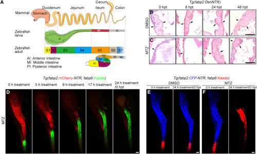 Ileal enterocytes migrate to the extensively injured jejunum (A) The anterior, middle, and posterior intestine of zebrafish larvae correspond to mammalian duodenum plus jejunum, ileum, and colon, respectively. The S1-S2, S3-S4, S5, and S6-S7 intestinal segments of zebrafish adults are equivalent to mammalian duodenum, jejunum, ileum, and colon, respectively. (B and C) In contrast to the uninjured intestine (B), H&E staining showed that the intestinal villi collapsed at 0 hpt and 8 hpt after MTZ-induced injury, then rapidly recovered at 24 hpt and 48 hpt (C). The arrowheads indicate basement membrane, while the arrows indicate villus. (D) Live imaging showed that the Kaede-green+ ileal enterocytes quickly responded to the MTZ-induced jejunal injury and migrated into the jejunum. See Video S1. (E and F) Photoconversion of Kaede-green to Kaede-red showed that in contrast to the uninjured control (E), the Kaede-red+ ileal enterocytes migrated into jejunum in response to extensive jejunal enterocyte damage (F). “24 h treatment” is equivalent to 0 hpt. Scale bars, 50 μm. See also Figures S1 and S2. |