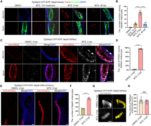 Ileal enterocytes proliferate after jejunal damage (A) In the uninjured control, the ileal enterocytes rarely underwent mitosis. By contrast, with MTZ treatment from 10 h to 0 hpt, the EdU+ enterocytes gradually increased and then decreased at 48 hpt. (B) Graph showing quantification of EdU+ cells among Kaede+ enterocytes (n = 8). Data are presented as mean ± SEM. ∗∗∗∗p < 0.0001, two-tailed unpaired t test. (C) In contrast to uninjured intestine, the fabp6+ enterocytes of injured intestine highly expressed PCNA at 0 hpt. (D) Graph showing quantification of ratio of PCNA+ among DsRed+ enterocytes (n = 6). Data are presented as mean ± SEM. ∗∗∗∗p < 0.0001, two-tailed unpaired t test. (E) Compared with DMSO treatment, fabp6+ enterocytes increased cell number after intestinal injury. (F) Graph showing quantification of number of fabp6+ enterocytes (n = 6). Data are presented as mean ± SEM. ∗∗∗∗p < 0.0001, two-tailed unpaired t test. (G) Cell size of fabp6+ enterocytes during MTZ treatment. (H) Graph showing quantification of volume of fabp6+ enterocytes (n = 14). Data are presented as mean ± SEM. Not significant (NS), two-tailed unpaired t test. Scale bars, 5 μm (G) and 50 μm (A, C, and E) |