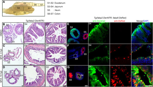 Ileal enterocytes contribute to jejunal enterocyte regeneration in adult zebrafish (A) The adult zebrafish intestine is subdivided into seven segments (S1 to S7). (B–D) H&E staining shows that in contrast to the uninjured control (B), the jejunal villi in S4 collapsed at 0 hpt and underwent morphological reconstructing at 72 hpt, whereas the ileal villi in S5 remained unaffected (C and D). (E–G) In the uninjured Tg(fabp2:DenNTR; fabp6:dsRed) transgenic adults, DsRed+ enterocytes were present in S5 but not in S4 (E). After MTZ-induced injury at 0 hpt, the DsRed+ enterocytes were observed in S4 (F), which became more evident at 72 hpt (G). The dash-framed areas are enlarged in the panels on their right. Scale bars, 50 μm. |