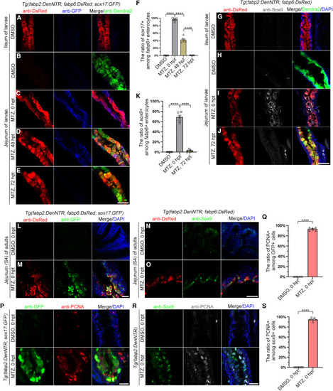 Migrated ileal enterocytes in both larvae and adults express gut precursor markers (A–K) In the uninjured larvae, ileal enterocytes did not express sox17:GFP transgene and Sox9 (A and G). In the MTZ-injured larvae, the migrated DsRed+ ileal enterocytes in the jejunum expressed the sox17:GFP transgene (B and C) and Sox9 (H and I) at 0 hpt, followed by expression of Dendra2 at 48 hpt (D), finally downregulating sox17:GFP transgene (E) and Sox9 (J) at 72 hpt. (F) Graph showing quantification of ratio of Sox17+ among DsRed+ enterocytes (n = 6). (K) Graph showing quantification of ratio of Sox9+ among DsRed+ enterocytes (n = 6). Data are presented as mean ± SEM. ∗∗∗∗p < 0.0001, two-tailed unpaired t test. (L–O) Similarly, in MTZ-injured adults, the migrated DsRed+ ileal enterocytes in the S4 segment of jejunum expressed the sox17:GFP transgene (L and M) and Sox9 (N and O) at 0 hpt. (P–S) The sox17+ (P) and sox9+ (R) cells expressed PCNA. Graphs show ratio of PCNA+ cells among the sox17+ (Q) and sox9+ (S) cells. Data are presented as mean ± SEM. ∗∗∗∗p < 0.0001, two-tailed unpaired t test. Scale bars, 50 μm. See also Figure S7. |