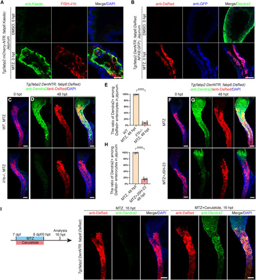 The IL1β-NFκB axis is activated in the migrated ileal enterocytes to promote transdifferentiation (A and B) At 0 hpt, in contrast to the uninjured control, the expression of il1b (A) and the activity of NF-κB (B) became activated in the migrated ileal enterocytes, as exhibited by FISH and NFKB:GFP reporter transgene, respectively. (C–H) In contrast to Tg(fabp2:DenNTR; fabp6:dsRed) transgenic larvae injured by MTZ, the il1b mutation or treatment with JSH-23 was ineffective in the anterior migration of the DsRed+ ileal enterocytes at 0 hpt (C and F) but exhibited defective transdifferentiation into the Dendra2+ jejunal enterocytes at 48 hpt (D and G). Graphs show quantification of ratio of Dendra2+ among DsRed+ enterocytes in jejunum for il1b mutant (E) and JSH-23 treatment (H). Data are presented as mean ± SEM. ∗∗∗∗p < 0.0001, two-tailed unpaired t test. (I) Treatment with ceruletide, an agonist of NF-κB, promoted the transdifferentiation from migrated ileal enterocytes to the jejunal enterocytes at 16 hpt (MTZ, n = 28; MTZ + ceruletide, n = 26). Scale bars, 50 μm. See also Figures S6 and S7. |