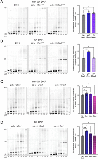 Insert-2 is important for stimulation of processive DNA synthesis across a G4 motif by pol κ. Polymerase extension assays were performed to measure the impact of Rev1 on DNA synthesis by a more processive TLS pol. Briefly, human pol κ (10 nM) was incubated with 13/42-mer primer-template DNA (200 nM) for 15 minutes before the reaction was initiated by the addition of solution that contained Rev1 (50 nM), MgCl2 (5 mM), and dNTP solution (0.2 mM total; 50 μM each for dATP, dCTP, dGTP, and dTTP). Pol extension was allowed to proceed at 37 °C before quenching at the indicated timepoints. Substrate and products were separated by PAGE using 14% (w/v) polyacrylamide gels with 7 M urea. (A) Pol extension assay results are shown for 13/42-mer non-G4 DNA where pol κ was incubated alone or in the presence of either WT hRev1 or the EY mutant. (B) Pol extension assay results are shown for 13/42-mer G4 DNA where pol κ was incubated alone or in the presence of either WT hRev1 or the EY mutant. (C) Pol extension assay results are shown for 13/42-mer non-G4 DNA where pol κ was incubated alone or in the presence of zRev1, yRev1, or lRev1. (D) Pol extension assay results are shown for 13/42-mer G4 DNA where pol κ was incubated alone or in the presence of zRev1, yRev1, or lRev1. Product formation for each reaction was quantified and normalized against the amount of product formed in the reaction with pol κ alone. The results are shown to the right of each set of gels and represent the mean (± std. dev.) of three independent replicates. Quantification of product formation by pol κ alone is re-plotted in each panel to allow more direct comparison with the reactions containing Rev1. p-Values were calculated using an ordinary one-way ANOVA with a Dunnett's multiple comparisons test where *** = p-value = 0.0008, **** = p-value < 0.0001, and ns = not significant. |
