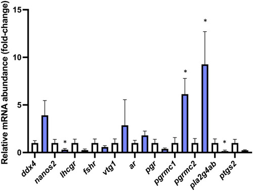Targeted gene expression analysis of selected transcripts with characterized roles in different stages of oocyte development in WT (n=7) and |