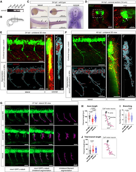 sorcs2 is expressed by spinal cord MNs, and its loss causes shorter and more branched motor axons in zebrafish embryos (A) RT-PCR shows sorcs2 expression in zebrafish embryos. (B) Zebrafish embryo at 24 hpf and analyzed areas. (C) Alkaline phosphatase WISH of sorcs2 at 24 hpf revealed sorcs2 transcripts in somites and spinal cord (SC; arrows). Coronal section exhibits enriched sorcs2 expression in the muscle (M) and notochord (NT). (D‒F) Fluorescent WISH labeled sorcs2 transcripts in Tg(mnx1:GFP)ml2 zebrafish embryos. sorcs2 was expressed by Mnx1+ MNs (arrow) at 24 hpf (D and E) and 48 hpf (F). (E and F) 3D view of z-stack confocal images of sorcs2 transcripts in mnx1:GFP embryos. Unilateral sections were reconstructed using Imaris-based surface-to-spot segmentation and filtered for transcripts co-localized with Mnx1-GFP+ MNs. (G–J) (G) Confocal z-stack images of injected mnx1:GFP embryos at 27 hpf. Motor axons were segmented as filaments (purple) and analyzed for their length (H), number of branches (I), and summarized (total) branch length (J). n = 63–70 neurons from 9–10 embryos/condition. All graphs show mean ± SEM. See also Figures S1 and S2. |
