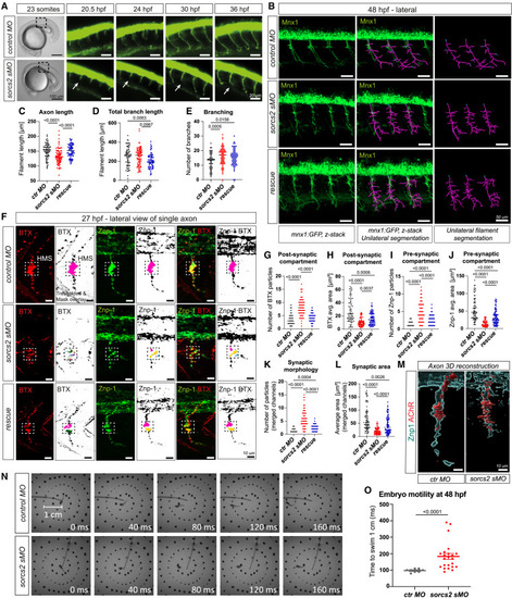 sorcs2 deficiency causes morphological defects at NMJs and lower motility in zebrafish embryos (A) Differential interference contrast images at 20.5 hpf and time-lapse of Tg(mnx1:GFP)ml2 embryos from 20.5 to 36 hpf. Truncated motor axons (arrows) of sorcs2 KD embryos pause longer at horizontal myoseptum (HMS) before continuing ventrally, but remain truncated at later stages. (B–E) (B) Confocal z-stack images of mnx1:GFP embryos at 48 hpf with reconstructed motor axons (purple). Filament quantification of axon length (C), branching (E), and total branch length (D). n = 70–84 neurons from 10–12 embryos/condition. (F) IF staining of the NMJs show z-stack projections of single axons labeled by Znp-1 (synaptotagmin-2; presynaptic compartment) and BTX-555 (AChRs; postsynaptic compartment) at 27 hpf. Black-and-white panels show segmented images with quantified NMJs. (G‒L) Quantification of HMS area revealed fragmented synapse morphology (K) while covering smaller synaptic area (L) in postsynaptic (G and H) and presynaptic (I and J) compartments. n = 90–99 axons from 10–11 embryos/condition. (M) Axonal 3D reconstruction of (F). (N) Touch-response assay of 48 hpf embryos. (O) Quantification of embryo motility. n = 10–21 embryos/genotype. All graphs show mean ± SEM. See also Figure S2; Videos S1, S2, S3, and S4. |