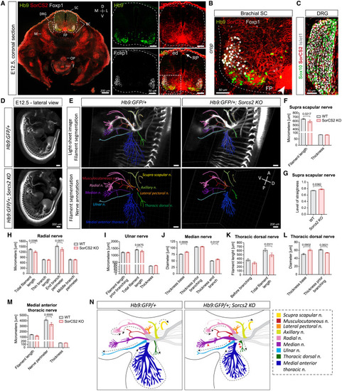 SorCS2 is expressed by murine MNs, and its loss causes shorter and thicker brachial nerves (A–C) IF staining of SorCS2 and MN markers in E12.5 mouse embryos. (A) SorCS2 is highly expressed in ventral horn, floor plate (FP; arrowhead), roof plate (RF; arrow), muscle (M), esophagus (OP), trachea (T), and boundary cap (BC) cells. D, dorsal; V, ventral; M, medial; L, lateral. (B) SorCS2 is highly expressed by all brachial MNs, in contrast to DRG precursors (Sox10+) and sensory neurons (Islet1+) (A and C). (D and E) Light-sheet images of whole-mount E12.5 embryos from Hb9:GFP lines alone (D), and combined with Imaris-based filament segmentation of nine annotated8 brachial nerves (E). D, dorsal; V, ventral; A, anterior; P, posterior. (F‒M) Quantification of the brachial nerves. (F and G) Supra-scapular nerve is shorter and straighter. (H) Radial nerve is shorter and its end branch perimeter is smaller while the side branches are unchanged. (I) Ulnar nerve is shorter while its thickness is unchanged. (J) Median nerve is thicker at its base but also before the final branching. (K) Thoracic dorsal nerve is shorter and thicker at its base (L), but narrower before the branching (L). (M) Medial anterior thoracic nerve perimeter is smaller while the thickness is unchanged. (N) A scheme summarizing observed phenotypes. Dashed arrows, affected length; arrowheads, changed thickness. n = 9 embryos/genotype. All graphs show mean ± SEM. See also Figures S3, S4, and S12; Videos S5, S6, S7, S8, and S9. |