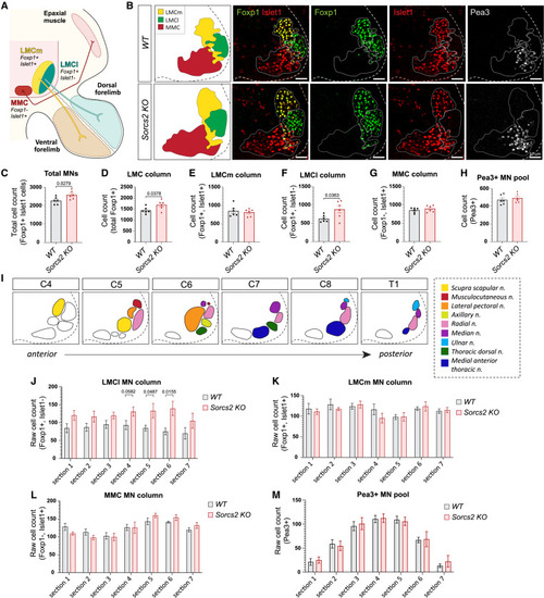 SorCS2 loss impairs cell-fate decisions of brachial MNs in lateral motor column (A) Motor columns of brachial spinal cord, their transcription factors, and their target areas at E12.5. (B) Coronal sections of right ventral horn at E12.5 with the corresponding motor columns labeled by IF. (C‒H, J‒M) Quantification of the MN cell-fate tracing. The cell count was either summarized (C–H) or presented in the individual sections for anterior-posterior occurrence (J–M). (C) sorcs2 KO embryos exhibit higher MN count, originating from increased LMC number (D), specifically the LMCl population (F and J). LMCm (E and K) and MMC (G and L) clusters were unaltered. Pea3+ motor pool did not change (H and M). The increase in LMCl MN count was significant in the posterior sections (J), which contain MNs of radial, medial, ulnar, medial anterior thoracic, and thoracic dorsal nerves. (I) Topographical localization of brachial MNs at E12.5, color-coded according to brachial nerves they form.8. n = 7 sections/embryo, 6 embryos/genotype. All graphs show mean ± SEM. See also Figure S5. |
