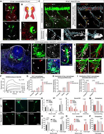 PGRN-induced motor neurite outgrowth requires SorCS2 expression in MNs (A) HCR3.0 on Tg(mnx1:GFP)ml2 embryos shows enriched grna in close proximity to motor axons (arrows) at 27 hpf, while sorcs2 is expressed by MNs (arrowhead). (B) Illustration depicting sorcs2 expression by MNs (yellow) and skeletal muscle (red), while grna (white) is enriched along motor axons (green). (C) HCR3.0 of grna and sorcs2 in Tg(mnx1:GFP)ml2 embryos at 48 hpf followed by Imaris-based segmentation. grna transcripts were filtered in cells within 5 μm proximity to Mnx1+ surface (orange; arrowheads) and inside the MNs (white). (D and E) (D) IF of PGRN and Iba-1 in coronal sections of brachial spinal cord of Hb9:GFP/+ embryos at E12.5. Hb9+ MNs express PGRN (arrowheads). PGRN is highly expressed by Iba1+ microglia (d′) and macrophages (d″) (arrows). (E) PGRN+ macrophages at branching points of medial and distal nerves. Some nerve-associated macrophages have low PGRN (arrowheads). SC, spinal cord; D, dorsal; V, ventral. (F) Surface plasmon resonance revealed concentration-dependent binding of hPGRN to immobilized hSorCS2. (G‒I) Quantification of PGRN+ macrophages associated with the Hb9+ motor axons in brachial spinal cord at E12.5. (G) Sorcs2 KO embryos exhibit more macrophages associated with the distal motor nerve. (H) Distribution of associated macrophages among quantified areas. (I) Distribution of nerve-associated macrophages in relation to their intracellular PGRN levels. n = 3 sections/embryo, 4 embryos/genotype. (J) IF of primary MN cultures grown without stimulation (mock), with 5 ng/mL BDNF, or with 100 ng/mL PGRN. (K‒P) Quantification of primary motor axon outgrowth as number of branches (K–M) and neurite length (N–P) of primary, secondary, and tertiary neurites, and when summarized. WT: mock = 37 neurons (n.), BDNF = 37 n., PGRN = 39 n. Sorcs2 KO: mock = 36 n., BDNF = 38 n., PGRN = 31 n. All graphs show mean ± SEM. See also Figure 1, Figure 2, Figure 3, Figure 4, Figure 5, Figure 6, Figure 7and Table S2. |
