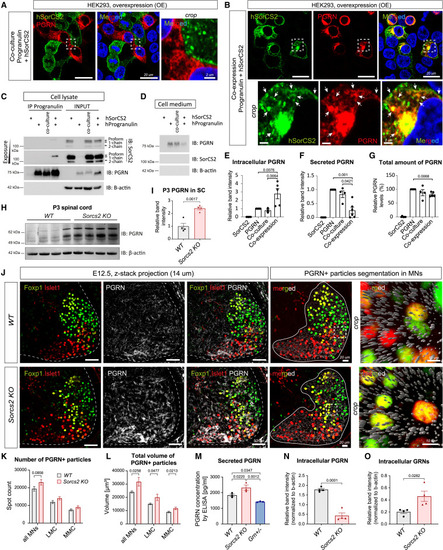 SorC2 binds PGRN to control its trafficking and secretion (A and B) IF of HEK293 cells overexpressing hPGRN and hSorCS2 as co-culture (trans configuration) (A) or co-expressing the plasmids in the same cell (cis configuration) (B). hPGRN and hSorCS2 do not co-localize in trans (A), but they do in vesicular structures and plasma membrane when in cis (arrows) (B). Hoechst-labeled nuclei (blue). (C) Co-IP of transfected HEK293 cells. SorCS2 binds PGRN in cis but not in trans. Arrows point at SorCS2 isoforms with the proform binding hPGRN. β-Actin served as a loading control for the input and negative control for the co-IP. (D) Immunoblotting of secreted hPGRN in transfected HEK293 cells. (E‒G) Compiled quantification of independent input samples from lysates and cell media blotted for hPGRN and HA-hPGRN. n = 4/5. When in cis, SorCS2 retains hPGRN intracellularly (E) while reducing PGRN secretion (F). (G) Total PGRN levels are decreased in cis but not in trans configuration. (H and I) (H) Immunoblotting of spinal cord from P3 pups (n = 4 pups/genotype). (I) The band intensity is normalized to the loading control. (J‒L) Confocal scanning and analysis of PGRN+ fluorescent signal in posterior coronal sections of brachial MNs at E12.5. n = 6 embryos/genotype. (J) IF staining of PGRN (left panels) was segmented in Imaris (right panels) as spots (gray). (K and L) LMC and MMC populations were either pooled (“all MNs”) or distinguished by Islet1 and Foxp1 IF. (K) Quantification of PGRN+ particle count. (L) Quantification of total volume of PGRN+ particles. (M) ELISA of conditioned media from primary cortical neuron cultures (DIV 7). Grn+/− served as semi-negative control. n = 3. (N and O) Immunoblot quantifications of lysates from the cortical cultures (n = 4). All graphs shown mean ± SEM. See also Figures S11 and S12; Video S10. |