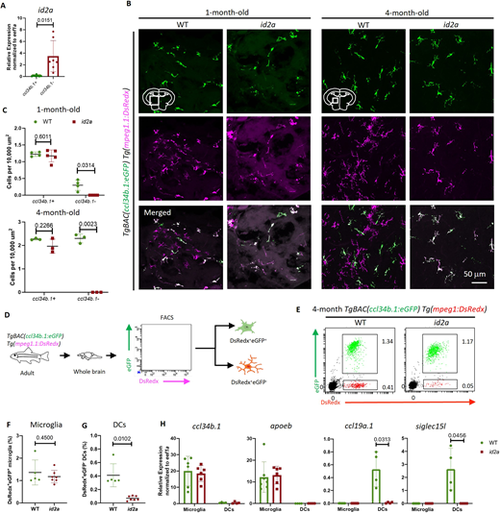 Brain-associated DCs are absent in the id2a-deficient mutants. (A) RT-PCR shows the expression levels of id2a in the ccl34b.1+ (GFP+DsRedx+) and ccl34b.1− (GFP−DsRedx+) cells sorted from 4-month-old TgBAC(ccl34b.1:eGFP);Tg(mpeg1.1:DsRedx) fish. n=7 for each group. (B,C) Representative images (B) and quantification (C) of the density of GFP+DsRedx+ and GFP−DsRedx+ cells in the transverse midbrain sections of 1-month-old and 4-month-old TgBAC(ccl34b.1:eGFP);Tg(mpeg1.1:DsRedx) WT or id2a mutant fish. n≥3 for each genotype. (D) Schematic of whole-brain FACS analysis of 4-month-old TgBAC(ccl34b.1:eGFP);Tg(mpeg1.1:DsRedx) WT fish and id2a mutants. ccl34b.1+mpeg1.1+ (DsRedx+eGFP+) and ccl34b.1−mpeg1+ (DsRedx+eGFP−) cells represent microglia and brain-associated DCs in WT, respectively. (E-G) Representative FACS plot (E) and the proportion (F,G) of ccl34b.1+mpeg1.1+ (DsRedx+eGFP+) and ccl34b.1−mpeg1+ (DsRedx+eGFP−) cells are presented as a percentage of total brain cells in TgBAC(ccl34b.1:eGFP);Tg(mpeg1.1:DsRedx) WT or id2a mutant brains. n=6 for WT and n=7 for id2a mutants. (H) RT-PCR shows the expression levels of microglia marker genes (ccl34b.1, apoeb) and brain-associated DC marker genes (ccl19a.1, siglec15l) in ccl34b.1+mpeg1.1+ and ccl34b.1−mpeg1.1+ cells collected from the brains of 4-month-old TgBAC(ccl34b.1:eGFP);Tg(mpeg1.1:DsRedx) WT or id2a mutants. n=6 for each genotype. Data are mean±s.d. Unpaired Student's t-test with Welch's correction. |