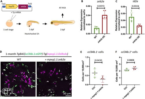 zeb2a inhibits DC development through repressing id2a expression. (A) Experimental design of zeb2a overexpression. The embryos injected with hsp70:zeb2a constructs and Tol2 transposase (TP) mRNA were heat-shocked at 1 dpf to induce the zeb2a expression. The heat-shocked embryos were collected at 2 dpf for RT-PCR analysis. (B,C) RT-PCR shows the expression levels of zeb2a and id2a in the whole embryo of 2 dpf WT and zeb2a-overexpressed fish. n=4 for each group. (D-F) Representative images (D) and quantification of the ccl34b.1+mpeg1.1+(GFP+DsRedx+) (F) and ccl34b.1−mpeg1.1+ (GFP−DsRedx+) cells (E) and their density in the transverse midbrain sections of 1-month-old TgBAC(ccl34b.1:eGFP);Tg(mpeg1.1:DsRedx) WT or mpeg1.1:zeb2a-injected fish. n=4 and 5 for WT and mpeg1.1:zeb2a-injected fish, respectively. Data are mean±s.d. Unpaired Student's t-test with Welch's correction |
