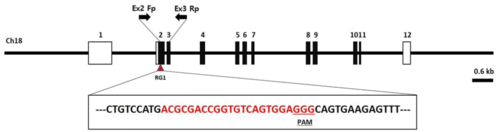Schematic representation of sgRNA (RG1) specific to exon 2 and primers for PCR genotyping of the zebrafish ints14 locus in chromosome 18. Nucleotide sequence in exon 2 indicating the location and sequence of gRNA target site, predicted double-stranded break (DSB) (red word), and protospacer adjacent motif (PAM) (GGG, red). |