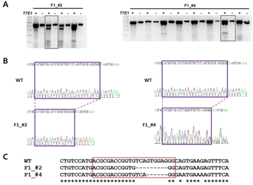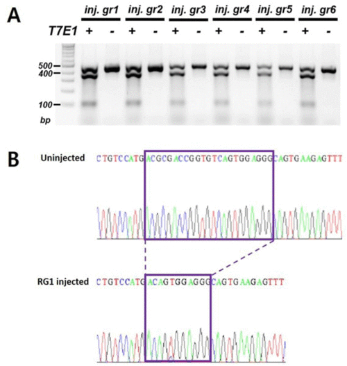 Test of activity for ints14 RGEN in zebrafish. (A) To identify the efficiency of the sgRNA, we co-injected ints14 sgRNA (RG1) and Cas9 protein. Co-injected embryos showed that the sgRNA efficiently generated mismatched DNA when the T7 endonuclease I (T7E1) assay was performed. (B) The TA-cloning and sequencing results demonstrate that a deletion of approximately 12 bp can be achieved via the RGEN system. |
