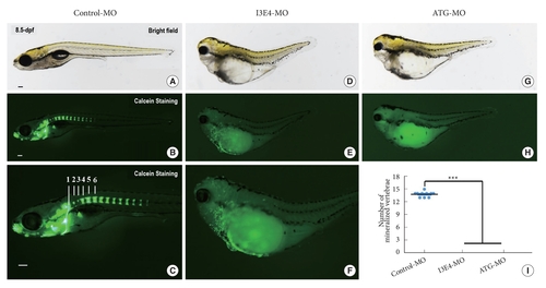 Loss of best1 causes abnormal craniofacial structure and vertebral development. (A–H) Representative bright field and fluorescent images of zebrafish skeleton at 8.5-dpf. In vivo visualization of the skeleton is achieved by the administration of a fluorescent dye (Calcein) directly to the fish water. Dyes that bind to calcified matrix can be used to label the entire skeleton. Lateral view (B, C) of the skeleton and mineralized vertebrae of day-8.5 embryos labeled with Calcein. Vertebrae 1, 2, 3, 4, 5, and 6 are indicated. (E, F, and H) When embryos injected with best1-morpholino (MO) at one-cell stage, the amount of stained mineralized tissue is markedly reduced compared to control-MO-injected fish. Vertebral development is significantly delayed in best1 morphants. (I) Quantification of the number of mineralized vertebrae at 8.5-dpf. Columns, mean; standard error of the mean (n = 10; analysis of variance), ***p < 0.0001. Scale bar, 100 μm. dpf, days postfertilization. PHENOTYPE: