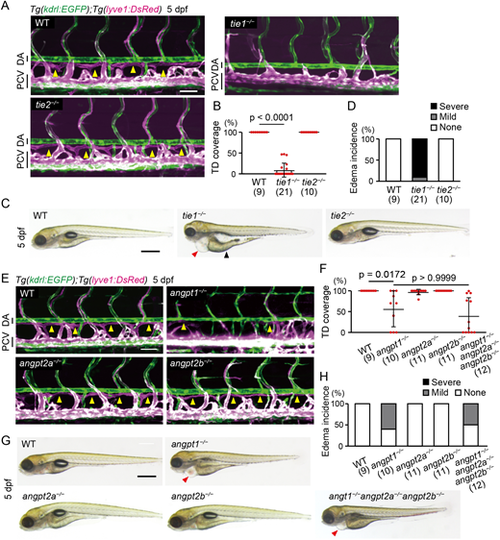 Angpt1 and Tie1 are essential for trunk lymphangiogenesis in zebrafish. (A) Representative confocal images of the trunk of Tg(kdrl:EGFP);Tg(lyve1:DsRed) WT, tie1−/− and tie2−/− larvae (5 dpf). These Tg larvae express EGFP (green) in all endothelial cells (ECs) and DsRed (magenta) in venous and lymphatic ECs. Formation of the thoracic duct (TD; yellow arrowheads in WT and tie2−/− larvae) was impaired in tie1−/− larvae. Lateral views, anterior to the left. (B) Percentage of TD coverage at 5 dpf. Data are mean±s.d. (WT, n=9 larvae; tie1−/−, n=21 larvae; tie2−/−, n=10 larvae). (C) Overall morphology of WT, tie1−/− and tie2−/− larvae (5 dpf). Red and black arrowheads point to edema around the heart and intestine, respectively. (D) Percentage of edema incidence at 5 dpf. Data are mean±s.d. (WT, n=9 larvae; tie1−/−, n=21 larvae; tie2−/−, n=10 larvae). Typical pictures of each category are shown in Fig. S2G. (E) Trunk of Tg(kdrl:EGFP);Tg(lyve1:DsRed) WT, angpt1−/−, angpt2a−/− and angpt2b−/− larvae (5 dpf). Formation of the TD (yellow arrowheads in WT, angpt2a−/− and angpt2b−/− larvae) was impaired in the angpt1−/− larvae. (F) Percentage of TD coverage at 5 dpf. Data are mean±s.d. (WT, n=9 larvae; angpt1−/−, n=10 larvae; angpt2a−/−, n=11 larvae; angpt2b−/−, n=11 larvae; angpt1−/−angpt2a−/−angpt2b−/−, n=12 larvae). (G) Overall morphology of WT, angpt1−/−, angpt2a−/−, angpt2b−/− and angpt1−/−angpt2a−/−angpt2b−/− triple-mutant larvae (5 dpf). Arrowheads point to edema around the heart. (H) Percentage of edema incidence at 5 dpf, as in D. Data are mean±s.d. (WT, n=9 larvae; angpt1−/−, n=10 larvae; angpt2a−/−, n=11 larvae; angpt2b−/−, n=11 larvae; angpt1−/−angpt2a−/−angpt2b−/−, n=12 larvae). Scale bars: 50 μm (A,E); 500 µm (C,G). P-values were determined by Kruskal–Wallis test with Dunn's test (B,F). DA, dorsal aorta; PCV, posterior cardinal vein. |