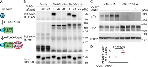 Zebrafish Tie1 (zTie1) acts as the receptor for zAngpt1. (A) Schematic of the in vitro binding assay for B. The detailed procedure is described in the Materials and Methods section. Light blue circle, protein G sepharose beads. (B) In vitro binding of zebrafish Tie1 (zTie1)-Fc-His, zTie2-Fc-His or Fc-His to FLAG-Angpt1, FLAG-Angpt2a or FLAG-Angpt2b was examined. (C) 293T cells transfected with full-length zTie1 (zTie1-HA) and a kinase-deficient mutant of zTie1 (zTie1K854R-HA) were starved and stimulated with vehicle (−) and COMP-Ang1 (+) for 20 min. Cell lysates were subjected to immunoblot analyses with anti-phosphotyrosine (pTyr) and anti-HA antibodies for analyzing phosphorylated Tie1 and total Tie1, respectively, and also with anti-β-actin antibody. (D) Relative phosphorylation of zTie1 observed in C was quantified. Data are mean±s.d. from three independent experiments; each experiment includes duplicate determinations. P-values were determined by two-tailed Student's t-test. |