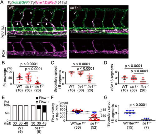 tie1 mutants exhibit defects in secondary sprouting from the posterior cardinal vein (PCV). (A) Trunk of Tg(kdrl:EGFP);Tg(lyve1:DsRed) WT and tie1−/− embryos (54 hpf). Formation of secondary sprouts (solid circles), PLs (arrowheads) and venous ISVs (V) were inhibited in tie1−/− embryos. (B) Percentage of PL coverage at 54 hpf. Data are mean±s.d. (WT, n=16 embryos; tie1+/−, n=38 embryos; tie1−/−, n=26 embryos). (C) Number of secondary sprouts scored across six segments at 54 hpf. Data are mean±s.d. (WT, n=16 embryos; tie1+/−, n=38 embryos; tie1−/−, n=26 embryos). (D) Number of vISVs scored across six segments at 54 hpf. Data are mean±s.d. (WT, n=16 embryos; tie1+/−, n=38 embryos; tie1−/−, n=26 embryos). (E) Percentage of WT and tie1−/− embryos with (+) and without (−) blood flow at 30, 36 and 48 hpf. The blood flow in tie1 mutants was gradually decreased during and after secondary sprouting (WT, n=9 embryos; tie1−/−, n=9 embryos). (F) Flow velocities in the PCV of Tg(kdrl:EGFP);Tg(lyve1:DsRed) WT/tie1+/− and tie1−/− embryos (45-46 hpf). Flow velocities were measured by tracking polyethylene glycol-coated fluorescent microspheres (PEG-coated FMs) injected intravascularly (see Movie 3). tie1−/− embryos showing normal flow velocities (360-485 µm/s) comparable to WT and tie1+/− siblings are indicated by blue dots and analyzed in G. Data are mean±s.d. (WT/tie1+/−, n=36 embryos; tie1−/−, n=52 embryos). (G) Number of secondary sprouts scored across six segments in WT/tie1+/− and tie1−/− embryos (45-46 hpf) at flow velocities between 360 µm/s and 485 µm/s, indicated as blue dots in F. Representative images and movie are shown in Fig. S6C and Movie 3, respectively. Data are mean±s.d. (WT/tie1+/−, n=15 embryos; tie1−/−, n=7 embryos). Scale bar: 50 μm. P-values were determined by one-way ANOVA with Tukey's test (B-D) and by two-tailed Student's t-test (G). PL, parachordal lymphangioblast. |