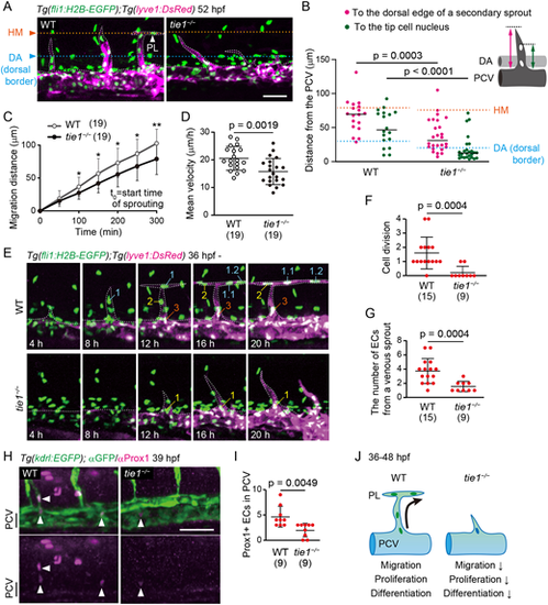 zTie1 regulates migration, proliferation and differentiation of sprouting ECs from the PCV. (A) Trunk of Tg(fli1:H2B-EGFP);Tg(lyve1:DsRed) WT and tie1−/− embryos (52 hpf). Orange, cyan and white dotted lines indicate horizontal myoseptums (HM), dorsal borders of the dorsal aorta (DA), and outlines of lyve1:DsRed-positive venous ECs, respectively. (B) Distance from the dorsal edge of the PCV to the dorsal edge of a secondary sprout (magenta dots) and to the tip cell nucleus (green dots) in WT and tie1−/− embryos at 52 hpf. Data are mean±s.d. (WT, n=18 sprouts in 4 embryos; tie1−/−, n=26 sprouts in 7 embryos). (C) Total distance traveled by the tip cell nucleus at each time point from the initiation of venous sprouting. Start time of sprouting (t=0) was 40.0±3.7 hpf in WT and 42.7±4.5 hpf in tie1 mutant. Data are mean±s.d. (WT, n=19 sprouts in 3 embryos; tie1−/−, n=19 sprouts in 4 embryos). *P<0.05; **P<0.01. (D) Mean velocity of the tip cell nucleus during the first 300 min of venous sprouting. Data are mean±s.d. (WT, n=19 sprouts in 3 embryos; tie1−/−, n=19 sprouts in 4 embryos). (E) Time-sequential images of the trunk of Tg(fli1:H2B-EGFP);Tg(lyve1:DsRed) WT and tie1−/− embryos from 36 hpf (when secondary sprouting starts in WT). White dotted lines outline lyve1:DsRed-positive ECs. (F) Number of cell divisions in a venous sprout from 36 to 56 hpf. Data are mean±s.d. (WT, n=15 sprouts in 4 embryos; tie1−/−, n=9 sprouts in 7 embryos). (G) Number of ECs from a venous sprout at 56 hpf. Data are mean±s.d. (WT, n=15 sprouts in 4 embryos; tie1−/−, n=9 sprouts in 7 embryos). (H) Whole-mount immunofluorescence staining for Prox1 (magenta) and GFP (green) in WT and tie1−/− Tg(kdrl:EGFP) embryos at 39 hpf. Arrowheads indicate Prox1-positive ECs. (I) Number of Prox1-positive ECs in the PCV across six segments at 39 hpf. Data are mean±s.d. (WT, n=9 embryos; tie1−/−, n=9 embryos). (J) During the process of lymphangiogenesis, ECs (green ovals) budding from the PCV migrate, proliferate, and undergo lymphatic differentiation. In contrast, all of these cell behaviors are inhibited in tie1 mutants. Scale bar: 50 μm. P-values were determined by two-tailed Student's t-test. |