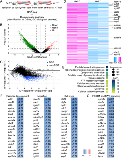 Tie1 signaling regulates gene expression involved in lymphatic development. (A) Schematic of the workflow. RNA-seq was performed in tie1−/− embryos and their WT and tie1+/− siblings (tie1+/?) (n=2 RNA samples each). (B) Volcano plot of the tie1−/− and tie1+/? gene set. The red, green and black dots represent upregulated (in tie1−/− embryos), downregulated and non-significant genes, respectively, with fold change >1 and P<0.05. (C) MA plot of 1942 DEGs (blue dots) with q-value <0.1 in the tie1−/− and tie1+/? gene set. (D) Heatmap of the most significant DEGs using log2(TPM+1) values. (E) Representative GO biological processes of the DEGs. (F) Heatmap of the DEGs associated with the GO terms ‘Vascular development’, ‘Migration’ and ‘Cell cycle’. Genes are ranked by log2 fold change tie1−/−/tie1+/?. (G) Heatmap of the DEGs associated with the FOXO1 and MYC signaling. Genes are ranked by log2 fold change tie1−/−/tie1+/?. |