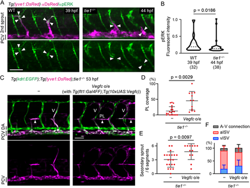 Tie1 regulates lymphatic development at least in part through the modulation of Vegfc/Vegfr3 signaling. (A) Whole-mount immunofluorescence staining for pERK (green) and DsRed (magenta) in WT and tie1−/− Tg(lyve1:DsRed) embryos. Arrowheads point to EC nuclei of secondary sprouts assessed by the DAPI staining. Secondary sprouts migrate towards the HM around 39 hpf in WT and 44 hpf in the tie1 mutant. (B) Quantitative analyses of the data shown in A. Fluorescence intensity of nuclear pERK staining (DAPI+ area, not shown in A) was quantified in the lyve1:DsRed+ ECs budding from the PCV of WT (39 hpf) and tie1−/− (44 hpf) embryos. Data are mean±s.d. (WT, n=32 ECs in 5 embryos; tie1−/−, n=38 ECs in 7 embryos). (C) Trunk of Tg(kdrl:EGFP);Tg(lyve1:DsRed) tie1−/− embryos with or without Tg(flt1:Gal4FF);Tg(10×UAS:vegfc) (53 hpf). Formation of PLs (arrowheads) and venous ISVs (V) are partially recovered by overexpression (o/e) of Vegfc in the tie1 mutant. (D) Percentage of PL coverage at 54 hpf. Data are mean±s.d. (tie1−/−, n=20 embryos; tie1−/− with Vegfc o/e, n=12 embryos). (E) Number of secondary sprouts scored across six segments at 54 hpf. Data are mean±s.d. (tie1−/−, n=20 embryos; tie1−/− with Vegfc o/e, n=12 embryos). (F) Number of A-V connections across six segments at 54 hpf. Data are mean±s.d. (tie1−/−, n=20 embryos; tie1−/− with Vegfc o/e, n=12 embryos). Scale bars: 50 μm. P-values were determined by two-tailed Mann–Whitney test (B) and by two-tailed Student's t-test (D,E). |