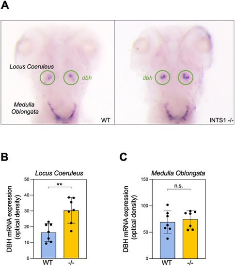Ints1-deficient zebrafish larvae exhibit increased dbh mRNA expression in the locus coeruleus but not in the medulla oblongata. (A) Representative image, showing of dbh mRNA expression by whole-mount in situ hybridization of 5 dpf Ints1-deficient (right) and WT sibling (left) larvae (dorsal views). The locus coeruleus is encircled (green). (B) Quantification of the dbh mRNA signal in the locus coeruleus reveals significantly elevated expression in Ints1-deficient (−/−) larvae compared with their WT siblings (**P<0.01, two-tailed t-test assuming equal variance; n=7). (C) Quantification of dbh mRNA levels in the medulla oblongata shows no difference between Ints1-deficient larvae and their WT siblings (n=7). Error bars in B and C represent ±s.e. |