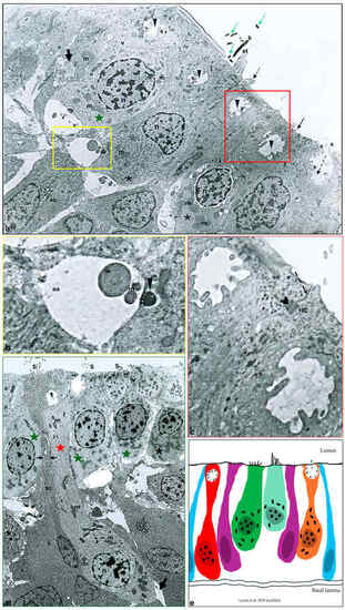 Transmission electron micrograph of a transverse section of an adult zebrafish (D. rerio) canal neuromast. Heterogeneity among sensory hair cells (HCs) can be observed. (a) A HC with a light cytoplasm (green star) and HCs with a more dense, strongly stained cytoplasm (asterisks), both with sparce heterochromatin nucleus (n), vesicle (v), and numerous electron-dense mitochondria (m), are evident. Note an HC showing a group of stereocilia with a typical staircase arrangement (st) in addition to a detached kinocilium (K) and its cross-sections (green arrows). Junction complexes between an HC and a support cell (sc) are indicated by a red inset. At the basal pole of the sensory hair cells, afferent (yellow inset) and efferent (thick arrow) synapses are visible. The occurrence of maturing HCs close to the apical surface is characterized by a peculiar crypt-like rounded space (arrowheads), with stereocilia (s). A maturing volcano-like HC, already reaching the neuromast lumen, with a peculiar depression (broken-arrow) and with the stereocilia surface projecting from the cell surface (s) to the lumen is identified. Elongated scs underneath or close to the HC, sending thin cytoplasmic projections apically, are evident. Note some microvilli (thin arrows) on the top of the sc. (b) Higher magnification of the basal pole of a sensory hair cell. Afferent synapse (aa) characterized by a classical pre-synaptic body (arrowhead) and a post-synaptic side with a clear cytoplasm and mitochondria (m) are visible. (c) Higher magnification of the apical surface of an HC and an sc. Zonula occludens at the apical surface (broken arrow) and more basally desmosomal-like junctions between the HC and sc are clearly visible (gallon arrow). Mitochondria (m). (d) Numerous HCs with dense (asterisk) and lighter cytoplasm (green stars) placed close to the neuromast apical surface. The occurrence of stereocilia (s) in the apical part of the HC. The occurrence of a maturing pear-shaped HC (red star) extending to the apical surface from the basal lamina to the apical surface of the neuromast. Note at the apical pole a peculiar, rounded space with some stereocilia inside (arrowhead). Note the distribution of heterochromatin in the nucleus (n). Mitochondria (m). Afferent synapse (arrow). sc with cytoplasmic projections (in between arrows) separating two adjacent HCs and extending to the apical surface. (a,d) 5000×, (b,c) 10,000×. (e) A graphical representation of the cell subpopulations of the neuromast sensory epithelium: mantle cells (blue), maturing crypt-like HC (red cell), sc (purple cells), hair cells with dense cytoplasm (green cell), hair cells with light cytoplasm (light green cell), maturing volcano-like HC (orange) (Laurà et al. [29] modified). |