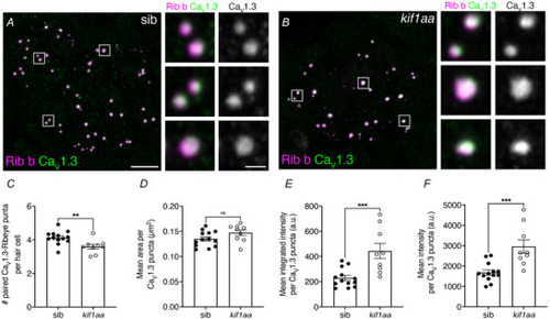 There are fewer paired Cav1.3‐Rib b puncta in |