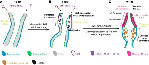The zebrafish arterial valve forms by direct differentiation of SHF progenitors. Model of zebrafish arterial valve formation. ( |