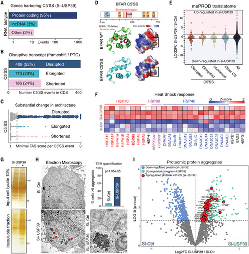 The translation of cryptic exons enhances aggregation of misfolded proteins. (A) Quantification of RNA biotypes affected by C5′SSs in si-USP39 HeLa cells (n = 3). lncRNA, long noncoding RNA. (B) Quantification of disrupted, shortened, and elongated C5′SS events affecting RNA coding sequences (CDS) in si-USP39 HeLa cells (n = 3). PTC, premature termination codon. (C) Feature architecture similarity (FAS) assessment identifies misspliced variants where an architecture difference implies a change in protein function. The FAS score ranges from 1 (identical architectures) to 0 (architectures share no features) (colored dots indicate a FAS <0.8; n = 3). (D) Shortened C5′SS BFAR variant with substantial architectural changes based on FAS (top). Red amino acids (aa) are only present in the BFAR canonical isoform owing to CS. At the bottom, Pymol and AlphaFold were used to predict and visualize the 3D structure and electrostatic potential (see also fig. S5B). (E) Translatome showing protein distribution between si-USP39 and si-Ctrl HeLa cells. Proteins with USP39-regulated CS events are shown (dark orange indicates disrupted C5′SS events, light orange indicates elongated C5′SS events, yellow indicates shortened C5′SS events, and light blue indicates other CS events. All genes detected were plotted as control (dark blue) (n = 3). FC, fold change. (F) Heat map representing gene expression (z-score) of heat shock genes for si-USP39 and si-Ctrl HeLa cells (n = 3). (G) Representative silver-staining experiment of input (10% total lysate) and insoluble (misfolded or unfolded) protein fractions in si-Ctrl and si-USP39 HeLa cells (n = 3). (H) TEM images of si-Ctrl and si-USP39 HeLa cells (red arrows indicate protein aggregates) (left; magnified images are shown on the bottom right) and quantification of cells with >5 aggregates in si-Ctrl and si-USP39 HeLa cells (top right) (data are means ± SD; two-tailed t test; si-Ctrl = 210 cells; si-USP39 = 82 cells; scale bars are 1000 nm). The magnified section of si-Ctrl was used as representative ER image in fig. S7F. (I) Proteomic volcano plot of protein aggregates (insoluble fraction) in si-USP39 and si-Ctrl HeLa cells [significantly (p < 0.05) decreased (blue) and significantly increased (green) proteins in si-USP39 cells are shown; red indicates significantly increased protein translated from misspliced transcripts in si-USP39 cells; n = 3]. |