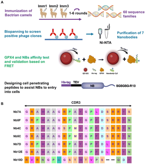 (A) Flowchart of anti-GPX4 NB screening (created with BioRender). (B) Amino acid sequences of NBs with different CDR3 domains. |