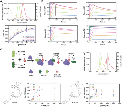 (A) QD-to-dye FRET assay to determine the GPX4 affinities of NBs. Top: absorption (dotted) and FL emission (solid) spectra of QD605 (green; 545–680 nm; resolution: 1 nm; excitation: 450 ± 5 nm; concentration: 1 μM) and Cy5-NHS (red; 610–785 nm; resolution: 1 nm; excitation: 540 ± 5 nm; concentration: 1 μM). Bottom: saturation binding curve of GPX4 and NBs from QD-to-Cy5 FRET assay. Kd values were fitted using the ‘One site-total’ model in Prism 8.0. Data are presented as the mean ± SD from three independent experiments. (B) Kinetic binding curves of GPX4 and NBs determined by SPR. The arrow indicates that the concentrations of NBs increased from 1.95 nM to 500 nM. (C) FRET measurement of the formation of the NB-GPX4-RSL3 ternary complex. Top-left: schematic representation of the FRET assay created with BioRender. Top-right: absorption (dotted) and emission (solid) spectra of Cy3-NHS (green) and Cy5-NHS (red). Optical band-pass filters (gray) were used for Cy3 (550/10 nm) and Cy5 (665/8 nm) detection in two detection channels. Bottom: FRET responses of GPX4 to different combinations of RSL3-Cy5 (left)/ML162-Cy5 (right) and four NBs. The assays included constant concentrations of NB-Cy3 and RSL3-Cy5 and varying concentrations of GPX4. FRET data are presented as the mean ± SD from three independent experiments. |