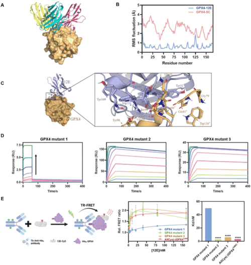 (A) Molecular modeling of GPX4 and NBs 12E (blue), 4C (purple) and 5C (yellow). (B) RMSF of GPX4 within GPX4-12E or GPX4-5C complexes. (C) Molecular surface and zoomed-in views of interactions of the GPX4-12E complex. (D) Kinetic binding curves of GPX4 mutants (mutants 1, 2 and 3) and 12E determined by SPR. The arrow indicates that the concentrations of NBs increased from 1.95 nM to 500 nM. AllCys(-)GPX4U46C,S44A, Q45A, K48A, E50A, AllCys(-)GPX4U46C, I129A, L130A, K135A, W136A and AllCys(-)GPX4U46C, P155A, M156A, E157A were named GPX4 mutants 1, 2, and 3, respectively. (E) TR-FRET measurement for the affinity tests of GPX4 mutants and 12E. Left: schematic representation of the TR-FRET measurement. Middle: affinity binding curves of GPX4 mutants and 12E via TR-FRET. The results were repeated two times and presented as mean ± SD (n = 2). Right: the Kd values of GPX4 mutants and 12E via TR-FRET. Kd was obtained by fitting the relative FRET ratio with the ‘One site-total binding’ model in Prism 8.0. ****p < 0.0001 vs. the vehicle control. |