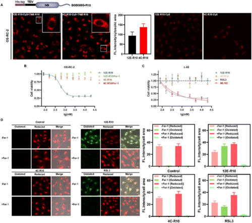 (A) Intracellular delivery efficiency of the NB-R10 fusion protein with TBN-R10 additives. Top: schematic design of NB-R10 fusion protein. Bottom: CLSM images of OS-RC-2 cells incubated with 5 μM 12E-R10-Cy5 or 4C-R10-Cy5 in the presence or absence of 10 μM TNB-R10 for 1 h at 37 °C. Excitation: 581 nm; emission: 580–650 nm; scale bar: 20 μm. Individual cytosolic fluorescence intensity of the CLSM images in the presence of TNB-R10 was processed with Image J software. (B) Viabilities of OS-RC-2 cells incubated with 12E-R10/4C-R10 and 10 μM TNB-R10 in the presence or absence of Ferrostatin-1 (−Fer-1, ferroptosis inhibitor) for 12 h at 37 °C. (C) Viabilities of L-02 cells incubated with 4C-R10/12E-R10 and 10 μM TNB-R10 additives, or small molecular inhibitors RSL3 and ML162 at 37 °C for 72 h. The results were repeated three times and presented as mean ± SD (n = 3). (D) Lipid peroxidation induced by 12E-R10, 4C-R10 and RSL3 based on C11 BODIPY581/591 cell imaging. OS-RC-2 cells were first incubated with 5 μM 12E-R10/4C-R10 (in the presence of 10 μM TNB-R10) and RSL3 (1 μM) at 37 °C for 2 h, and then incubated with 1 μM C11 BODIPY581/591 for 30 min for imaging; scale bar: 20 μm. Cells were also pre-incubated with (+Fer-1) or without Fer-1 (−Fer-1). Individual cell fluorescence intensity in different channels of the CLSM images (processed with Image J software) was indicated on the right of the images. |