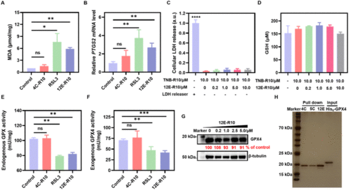 Bio-evaluations of ferroptosis related parameters. (A) MDA assay. (B) PTGS2 mRNA detection. (C) LDH release. (D) GSH concentrations. (E) Endogenous GPX activity. (F) Exogenous GPX4WT activity. (G) WB analysis of GPX4 degradation. (H) Proteome profiles of 4C-R10, 5C-R10 and 12E-R10 assessed by SDS-PAGE (silver staining). Lane 1: marker; Lanes 2–4: 4C-R10, 5C-R10 and 12E-R10 pull-down of OS-RC-2 cell lysates; Lane 5: recombinant GPX4 protein sample. OS-RC-2 cells were incubated with 5 μM 12E-R10/4C-R10 in the presence of 10 μM TNB-R10 or 0.8 μM RSL3 for 4 h (A, B, and E). (A–F) Results were repeated three times and presented as mean ± SD (n = 3). *p < 0.05, **p < 0.01, ***p < 0.001, and ****p < 0.0001 vs. the vehicle control. |