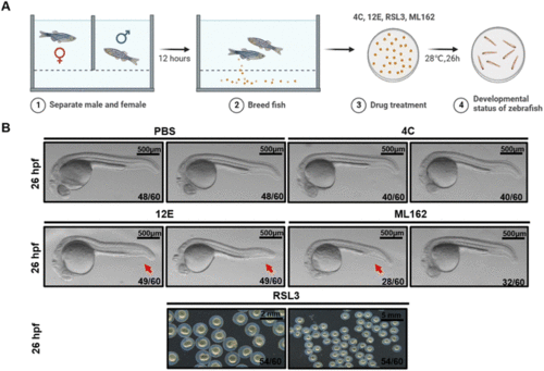 Zebrafish dorsal organizer formation impaired by NB 12E. (A) Schematic representation of the observation for early development of zebrafish. (B) Brightfield images of the wild-type (WT) embryos at the indicated stages after the injection of 7 μM RSL3/12E/4C and PBS (the injection volume is 1 nL). The red arrow indicates the reduced ventral tail fin. The frequency of embryos with the indicated patterns is shown in the bottom right corner of each panel. Lateral views with anterior to the left. Scale bar = 500 μm. |
