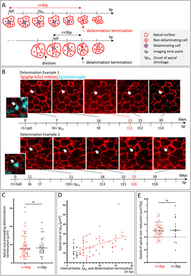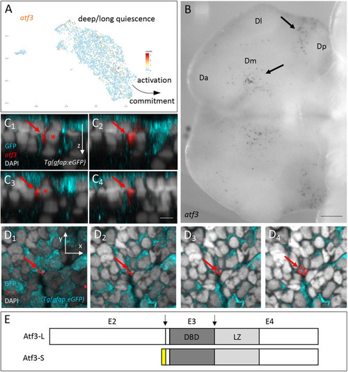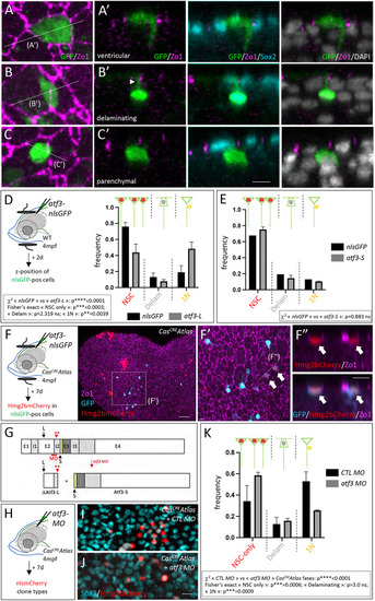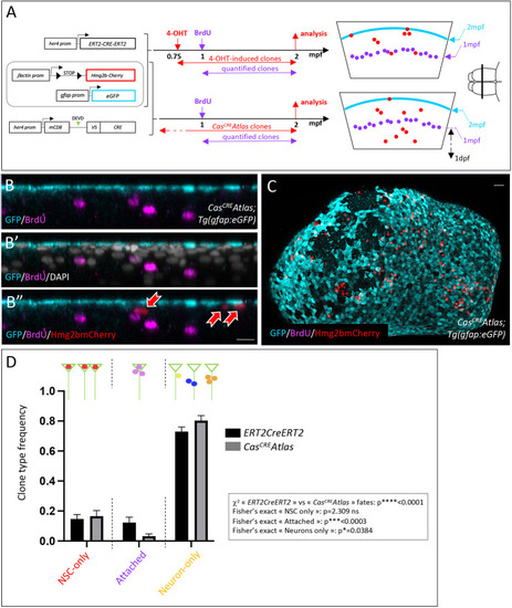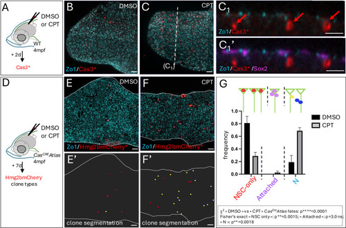 CasCREAtlas reveals non-apoptotic caspase events during pallium development and homeostasis. (A) Experiments carried out in the present study shown in relation to the zebrafish lifetime. (B) Schematics of the transgenic lines used. CasCREAtlas combines an NP/NSC-specific driver line (top and middle) expressing Cre upon Cas3*/Cas7* cleavage and a reporter line (bottom) expressing hmg2bmCherry upon Cre recombination. mCD8, membrane anchor; V5, antigen segment (tag); DEVD, canonical Cas3*/Cas7* cleavage site; GSGC, non-productive cleavage site; her4 prom, her4 regulatory elements. The Tg(her4:mCD8-DEVD-V5-Cre);Tg(βact;lox-stop-lox-hmg2bmCherry) background is referred to as CasCREAtlas, and Tg(her4:mCD8-GSGC-V5-Cre);Tg(βact;lox-stop-lox-hmg2bmCherry) as ‘control’. All analyses were conducted in double heterozygotes. (B′) Schematic of analyses in cross-sectioned or whole-mount pallia at 6 dpf. (C) Expression of the CasCRE driver is confined to gfap:eGFP-positive cells. Pallial cross-sections of Tg(her4:mCD8-DEVD-V5-Cre);Tg(gfap;eGFP) larvae at 6 dpf with IHC for GFP (NP/NSC), Zo1 (tight junctions, delimiting apical surfaces) and V5 (transgene tag), showing V5 (membrane anchored) and GFP in the same cells. (D-F) Hmg2bmCherry whole-mount IHC on CasCREAtlas (D) and control (E) pallia at 6 dpf (dorsal views, z-projections, anterior left); quantification of positive cells (F) (CasCREAtlas: n=4 brains; control: n=10 brains; Mann–Whitney test). (G-J) CasCREAtlas activity is induced by camptothecin (CPT). (G) Schematic of the experiment: CPT (20 µM) or DMSO was injected into the neural tube ventricle in CasCREAtlas larvae at 4 dpf; Hmg2bmCherry was analyzed at 6 dpf. (H-J) Hmg2bmCherry whole-mount IHC at 6 dpf (dorsal views, z-projections, anterior left) and quantification (J) (DMSO and CPT: n=6 brains each; Mann–Whitney test). (K-M′) Hmg2bmCherry expression in CasCREAtlas (L,L′) and control (M,M′) pallia at 1.5 mpf. (K) Schematic of whole-mount pallia at 1.5 mpf. (L-M′) Whole-mount IHC for Sox2 (NPs, NSCs and some freshly born neurons) and Hmg2bmCherry (dorsal views, z-projections, anterior left). L1 and L2 show cross-sections as indicated in L, dorsal up. Red arrows indicate Sox2neg neurons, thin yellow arrow Sox2pos neurons, and short yellow arrow a Sox2pos NSC. Scale bars: 10 µm (C-E,H,I); 50 µm (L-M′,L1,L2).