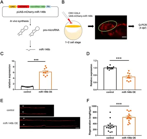 Reprogramming miR-146b-snphb signaling promotes M-cell axon regeneration. A Schematic of the in vivo overexpression system of miR-146b. B Validation of vector-based miR-146b overexpression. The circle indicates neurons in the brain that express fluorescent signals. C MiR-146b levels were significantly increased by vector-based expression in vivo. D Quantitative RT-PCR showed that the expression of snphb was significantly reduced at 10 hpf in embryos overexpressing miR-146b. E, F Representative images of control (UAS-mCherry) and miR-146b OE axon regeneration results. Statistical results showed that miR-146b OE enhanced axon regeneration in zebrafish M-cells. Control: 322.1 ± 49.65 μm; miR-146b OE: 622.2 ± 42.48 μm. White asterisk denotes the injury site. Scale bar, 50 μm, *** P < 0.001, error bars indicate SEM. |