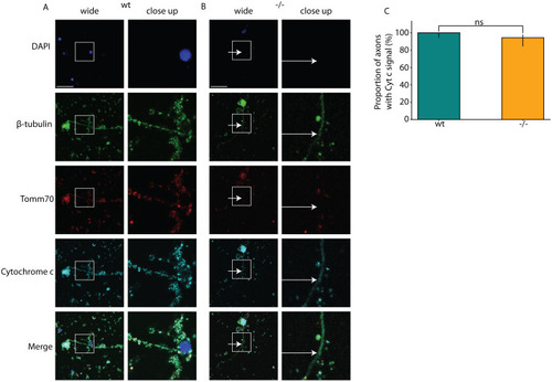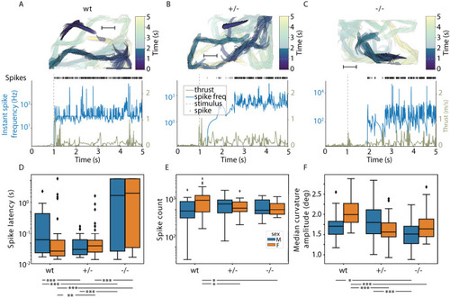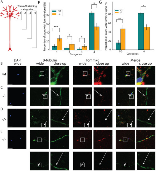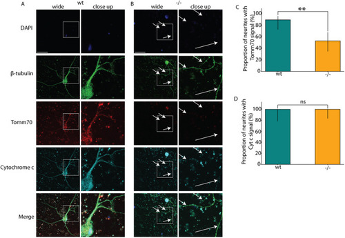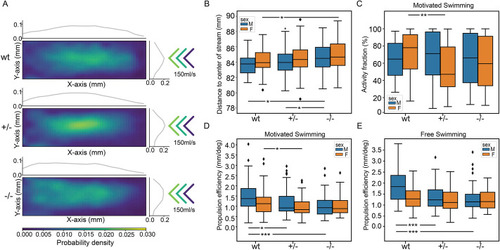 Locomotion defects in tomm70 mutant fish. (A) Two-dimensional heat map with marginal histogram showing all possible locations of female fish in the setup. Blue represents low location probability; yellow represents high location probability. Although wt and heterozygous mutant female fish remain in the centre of the stream, the homozygous female mutants avoid it and reside at a longer distance from the centre of the stream. (B) Box plot of mean distance of fish to the centre of stream, propulsion efficiency and activity fraction. The black line represents the median of all individuals, the box displays the upper and lower quartiles, the whiskers denote 1.5 times the interquartile distance, and the diamonds mark outliers. There is a significant increase in the mean distance of homozygous mutant male and female fish from the centre of stream compared to that for their wt counterparts. (C) Activity is defined as the percentage of video frames in which swimming velocity exceeded 0.025 m/s. Decrease in the activity of heterozygous and homozygous female fish compared to that of female wt fish was observed during motivated swimming trials. There is no change in the activity fraction of male mutants. The activity fraction is normalised to the time period of recording the activity of the fish, which is 30 s for motivated swimming. (D,E) Reduction in the propulsion efficiency of heterozygous and homozygous mutant males and females compared to that of wt males and females in motivated (D) and free-swimming (E) trials. Propulsion efficiency is defined as the number of bends produced by the fish per distance covered in a given time period. N=59 (female wt), 150 (female +/−) and 65 (female −/−), and N=46 (male wt), 91 (male +/−) and 84 (male −/−), in free-swimming trials; N=59 (female wt), 150 (female +/−) and 66 (female −/−), and N=45 (male wt), 96 (male +/−) and 81 (male −/−), in motivated swimming trials; and female N=45 (female wt), 91 (female +/−) and 57 (female −/−), and male N=46 (male wt), 60 (male +/−) and 75 (male −/−), in counter-current trials. Statistical significance was tested using Fisher's permutation test. *P<0.05, **P<0.01, ***P<0.001.
