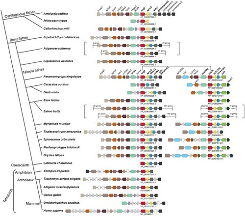 Genome synteny of scg2 homologs from representative jawed vertebrates. The simplified tree topology, adapted based on Fig. S1, is shown on the left side of the figure, whereas their corresponding scg2-containing loci are shown on the right. Each orthologous gene group is represented by an arrowed box highlighted in different colors based on their annotations, shown above the locus. The genes encoding hypothetical proteins are shown in white boxes, noncoding RNAs in the gray boxes, and tRNA genes in triangles. The accession numbers of the scg2 homologs are indicated below the loci. The genome duplication events found in Acipenser ruthenus, ancestor of teleost fishes, and Salmo trutta, determined based on Fig. S2, are indicated by the red dots on the tree (left) and square brackets on the genome synteny (right). Only a part of duplicated regions in A. ruthenus and S. trutta are shown. |