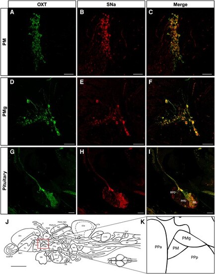 Immunocytochemical localization of Oxt-ir and Scg2a/SNa-ir in female zebrafish. Microscopy imaging of Oxt-ir (green) and Scg2a/SNa-ir (red) preoptic magnocellular (PM; A–C) and gigantocellular (PMg; D–F) regions, and pituitary (G–I). Merged images show colocalization (yellow-orange) of both immunoreactivities in these paraffin sections. RPD, rostral pars distalis; PPD, proximal pars distalis; NIL, neurointermediate lobe. A–F) 20× magnification; G–I) 10× magnification. The position of the PM and PMg relative to the zebrafish forebrain (J), and the PPa and PPa (anterior and posterior parts of parvocellular preoptic nucleus) are shown for reference. Scale bars in A–I = 50 µm. Scale bar in J = 500 µm |
