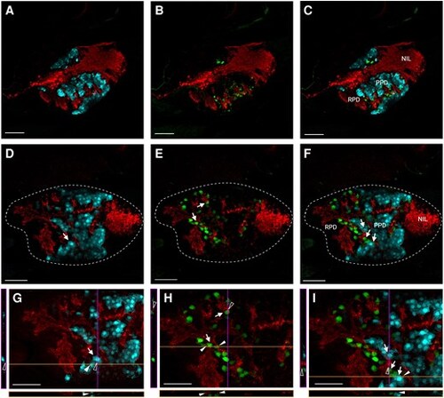 Distribution of Scg2a/SNa-ir in the pituitary of female Tg(lhb-RFP × fshb-eGFP) zebrafish. Confocal microscopy images obtained from cryosections (20 µm) show the distribution of Scg2a/SNa-ir (red), lhb-RFP (cyan blue), and fshb-eGFP (green). The border of the entire pituitary gland is delineated with the white dashed lines, and solid white arrows (D, E, F) indicate cells of interest in magnified images (G, H, I). Optical slices in the horizontal plane (orange line) and vertical plane (purple line) are indicated left and bottom of the panels (G, H, I). Open arrowheads indicate SNa-ir in proximity to but not found in transgenic cells along the x-plane. Solid arrowheads indicate SNa-ir in proximity to but not found in transgenic cells along the y-plane. RPD, rostral pars distalis; PPD, proximal pars distalis; NIL, neurointermediate lobe. Scale bars = 50 µm. |