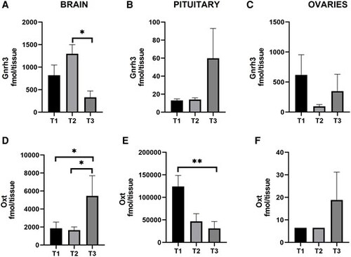 Gnrh3 and Oxt levels during the periovulatory period in brain, pituitary, and ovaries of female zebrafish. The time points represent (T1) 02:00 h, (T2) 05:00 h, and (T3) 08:30 h. Gnrh3 in brain (A), pituitary (B), and ovaries (C). Oxt in brain (D), pituitary (E), and ovaries (F). Results are presented as mean + SEM (n = 10). Note the different scales on the y-axes. The Kruskal–Wallis one-way ANOVA on ranks was performed followed by a Tukey test. *P < 0.05. **P < 0.01. |