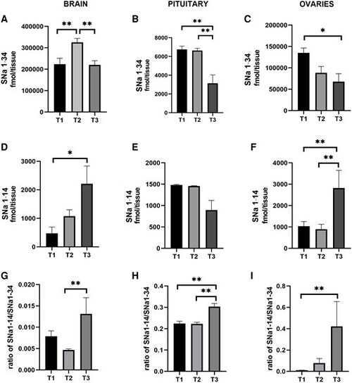 SNa levels vary during the periovulatory period in brain, pituitary, and ovaries of female zebrafish. The time points represent (T1) 02:00 h, (T2) 05:00 h, and (T3) 08:30 h. SNa1–34 in brain (A), pituitary (B), and ovaries (C). SNa1–14 in brain (D), pituitary (E), and ovaries (F). Ratio of SNa1–14 to SNa1–34 in brain (G), pituitary (H), and ovaries (I). Results are presented as mean + SEM (n = 10). Note that the different scales on the y-axes. The Kruskal–Wallis one-way ANOVA on ranks was performed followed by a Tukey test. *P < 0.05. **P < 0.01. |