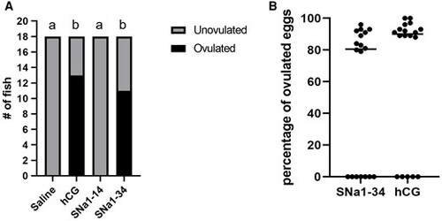 Ovulation of female zebrafish 6 h, following i.p. injection with saline, SNa1–14, SNa1–34, and hCG. A) The number of ovulating females was compared using Fisher’s exact test. Different letters (a, b) above the bars indicate a significant difference (P < 0.01) in the number of ovulated females. B) The percentage of ovulated eggs in female zebrafish injected with SNa1–34 or hCG. Individual levels are depicted along with median values (horizontal line; n = 18); Mann–Whitney U test; P > 0.05. Note that females that did not ovulate are depicted as black dots along the 0 point of the x axis. |